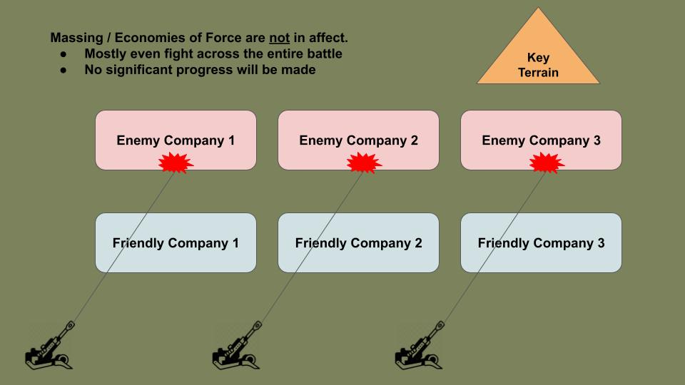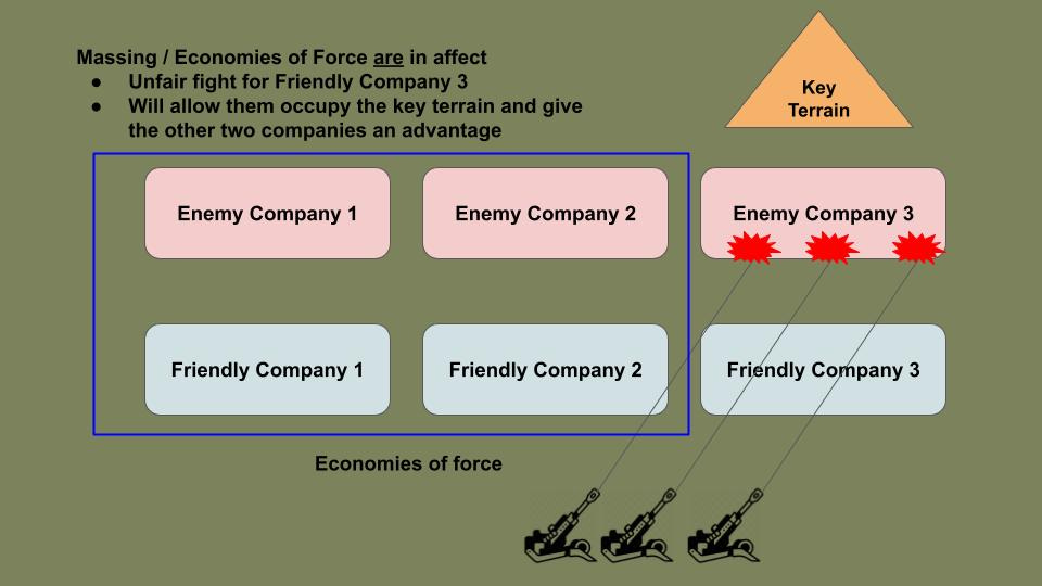 This decision means stripping artillery support from the other two companies. Those units will almost certainly take increased casualties. You accept this risk because concentrating fires on the decisive terrain dramatically increases the probability of success for the entire battalion.